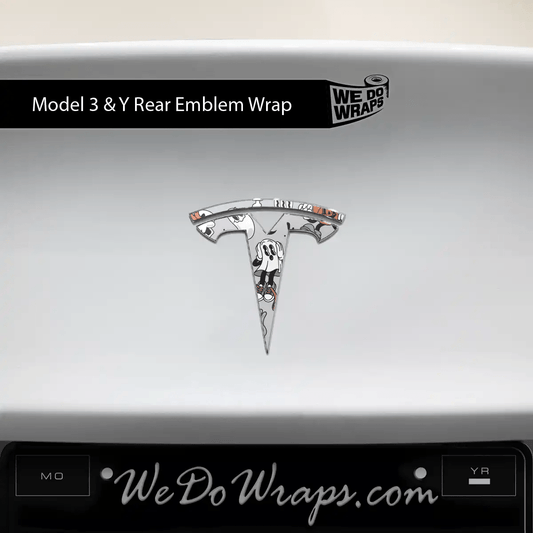 Trick-or-Treat Ghost Tesla Emblem Decals (Front + Back) | Model 3