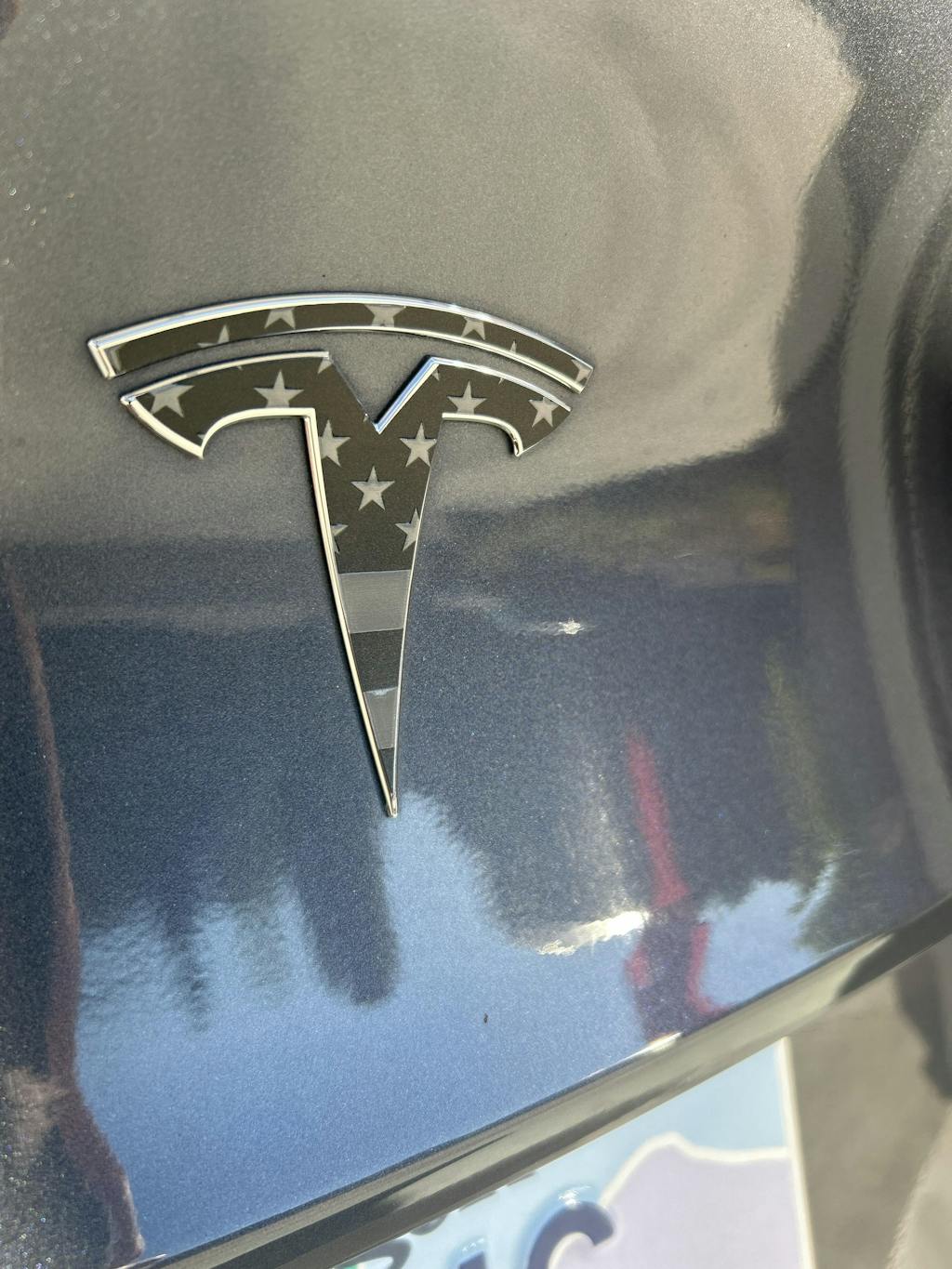 Fuel your journey with our slick gloss dark grey on matte black American flag emblem decal, where the spirit of patriotism meets a rebellious edge, making your Tesla stand out in style.